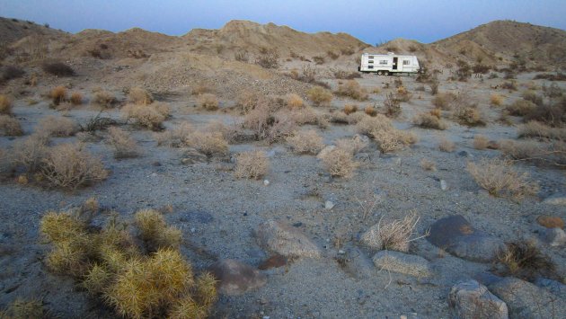 "A quick sunset hike up a nearby hill produced this stunning view of our trailer and the Anza Borrego Desert at the Arroyo Salada Primitive Campground. Our trailer is hard to see but if you look dead center and then just slightly to the left you can see our 2003 Ajo travel trailer pulled by a 2003 Chevy Suburban."