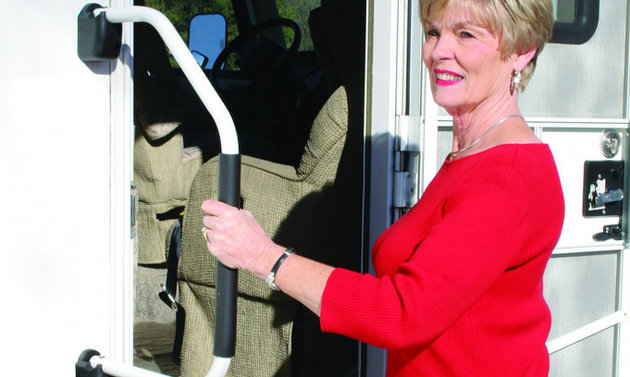 When you go up and down the stairs to enter or exit your RV, this hand rail gives you the steady support you need. It can be locked open when you need to use it, and then it can fold in and lock against the side of your RV when you're ready to travel again. No tools are required to do this, although it is designed to be mounted on the left side. If you prefer to mount it on the right side, you may need to add support backing.